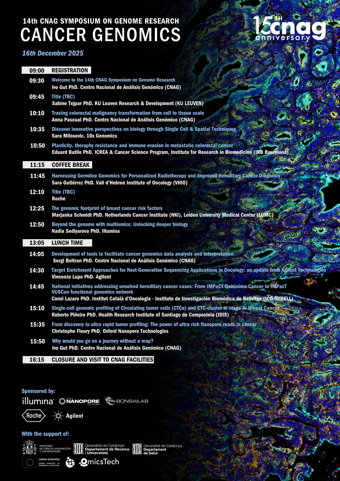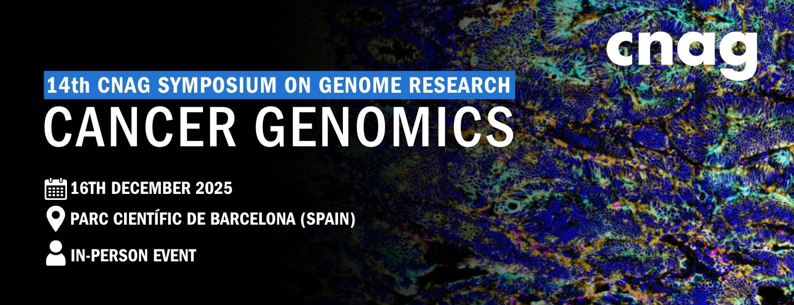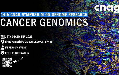 The 14th CNAG Symposium on Genome Research: Cancer Genomics will take place on Tuesday, 16 December 2025, from 09:00 to 16:30 at the Auditori Antoni Caparrós, located in the Parc Científic de Barcelona (Carrer Baldiri Reixac 4, Tower D, 08028 Barcelona).