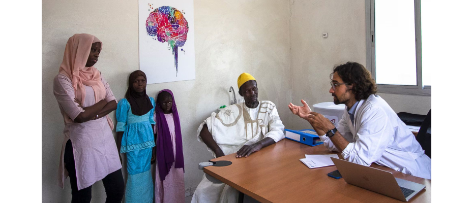 Photo Credit: Marta Moreiras. Published in El País. Neurologist Pedro Rodríguez Cruz informs Babacar Diaw and his three daughters about the illness affecting little Soda (in the center of the three) during his consultation at Fann Hospital in Dakar. Diaw, a 59-year-old farmer, lives with his family in the village of Keur Madiabel, in the Kaolack region of Senegal. A couple of years ago, little Soda began having trouble holding objects. She suffers from a rare disease, Brown-Vialetto-Van Laere syndrome.